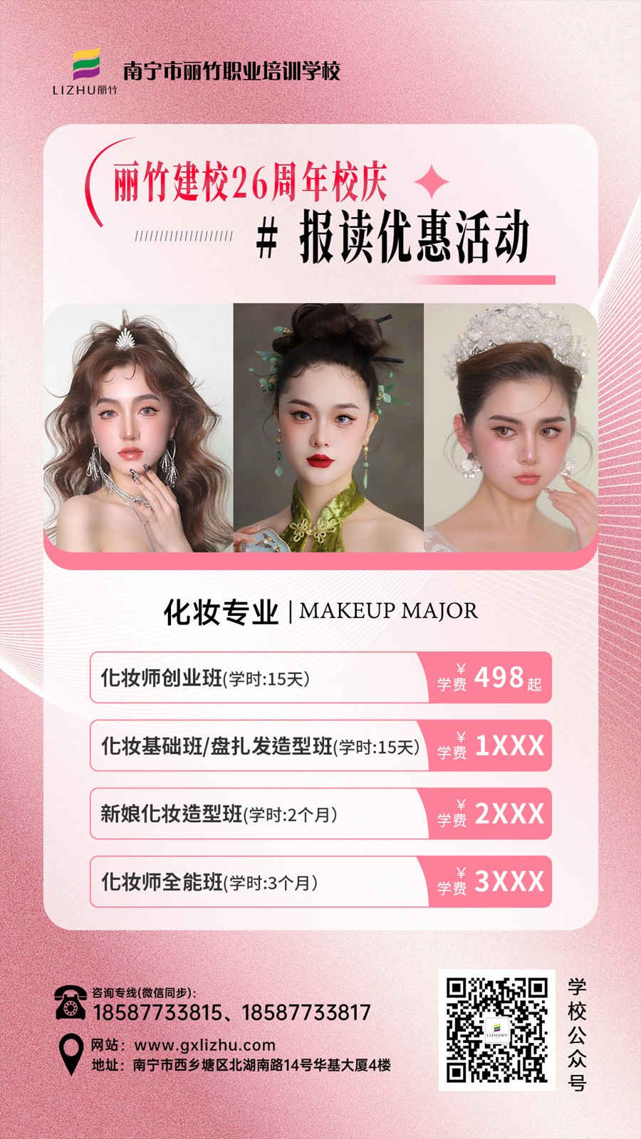 想要畫出一個精致完整的妝容,你需要掌握全面切系統(tǒng)的化妝培訓手法,這樣才能將每個化妝步驟所帶來的效果很好呈現(xiàn)出來。所以,想在南寧學化妝技術,想知道南寧化妝學校哪家學費便宜?那千萬不要錯過麗竹學校現(xiàn)在正在進行的“優(yōu)惠報讀”啦!