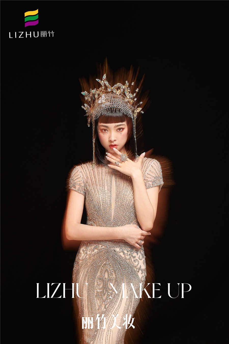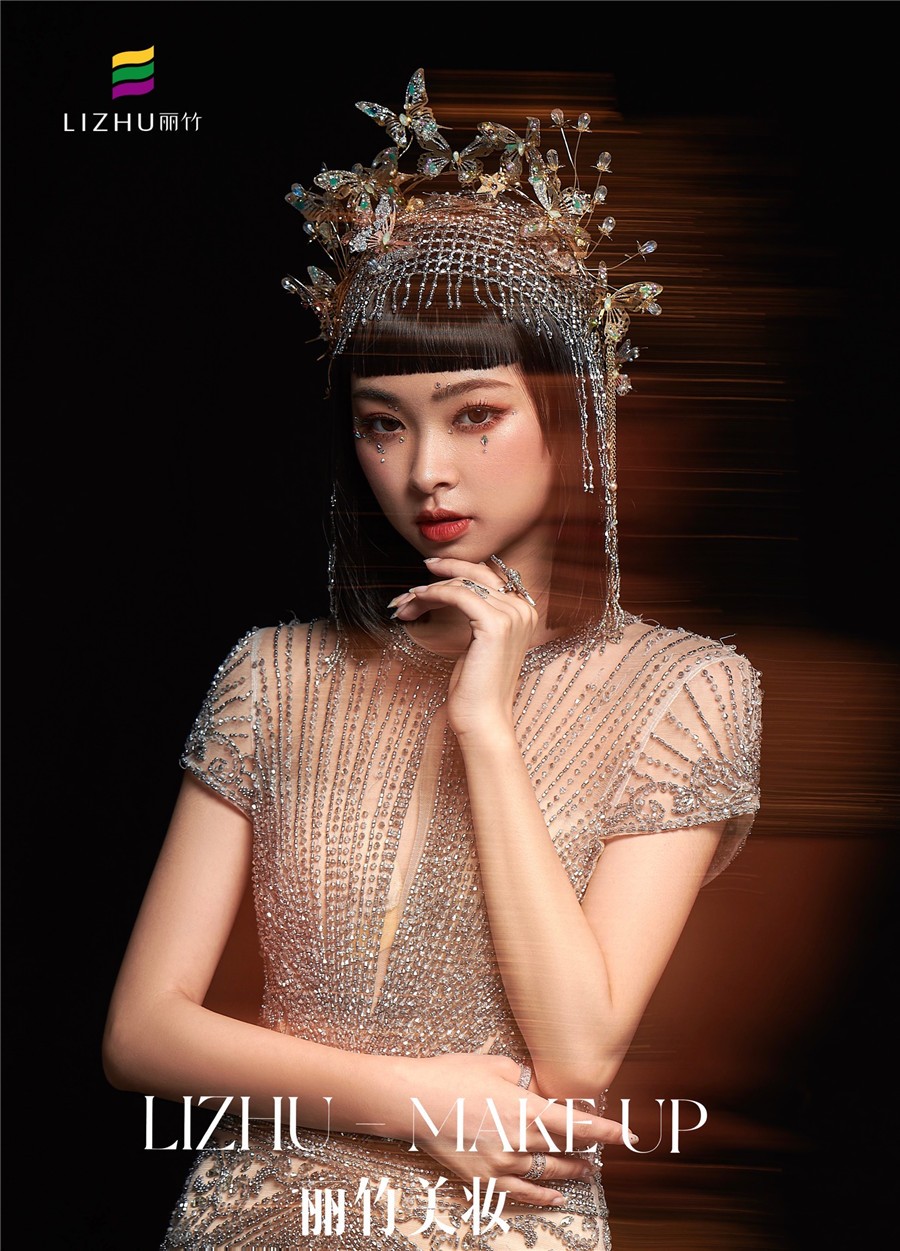 麗竹化妝學校作品---輕奢復古造型:奢華透視薄紗款禮服,勾勒出婀娜曼妙的身姿,頭飾與服飾滿鉆的鑲嵌,閃爍波光粼粼的神秘感,如夢如幻間與現(xiàn)實交替!