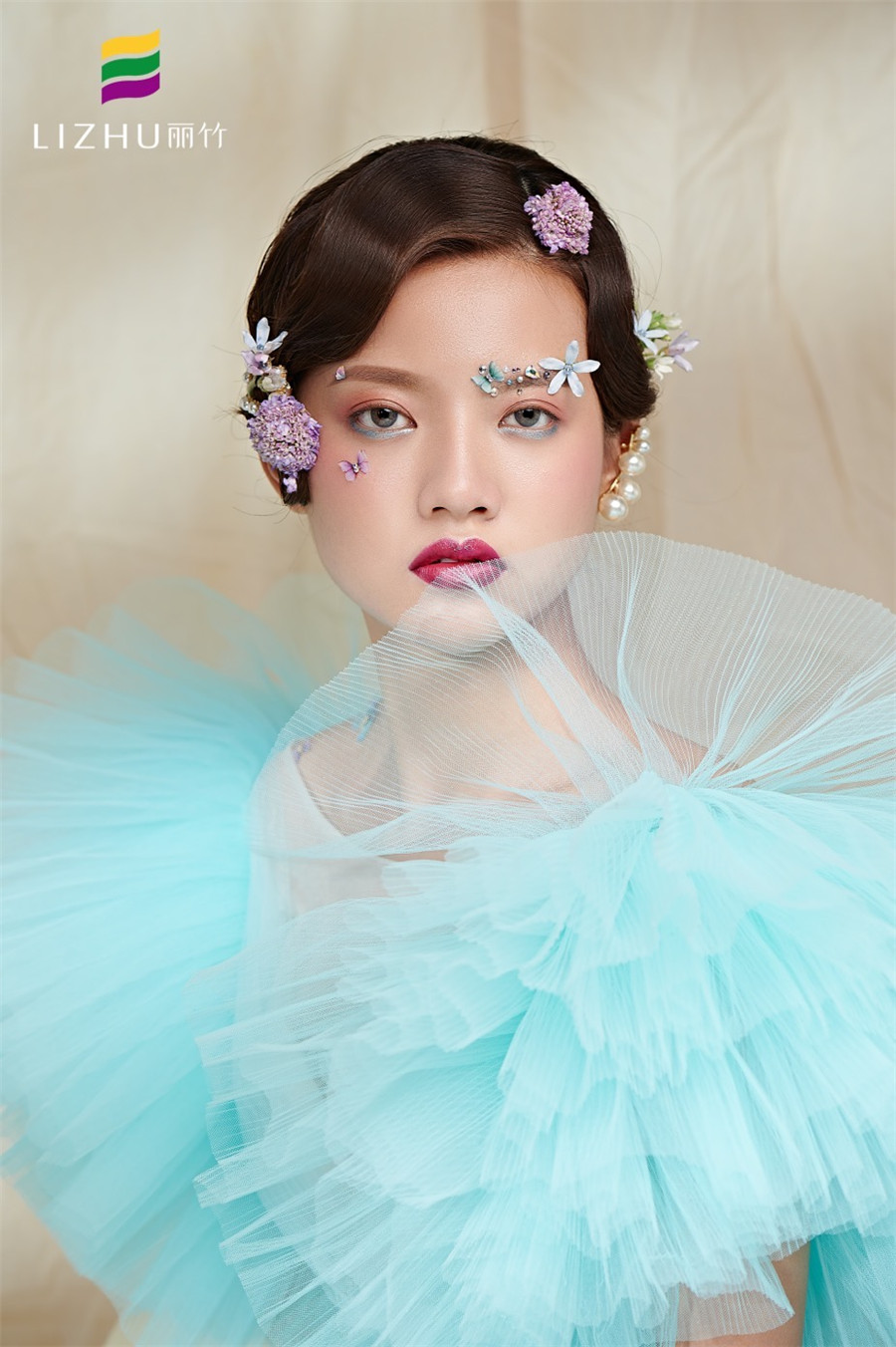 麗竹學(xué)校彩妝作品---流光·化蝶 ·夢幻:藍(lán)色輕紗加上妝容花朵點(diǎn)綴,頭飾與發(fā)型的完美搭配,流淌出輕柔舒緩之美,簡約自然的情緒態(tài)度。