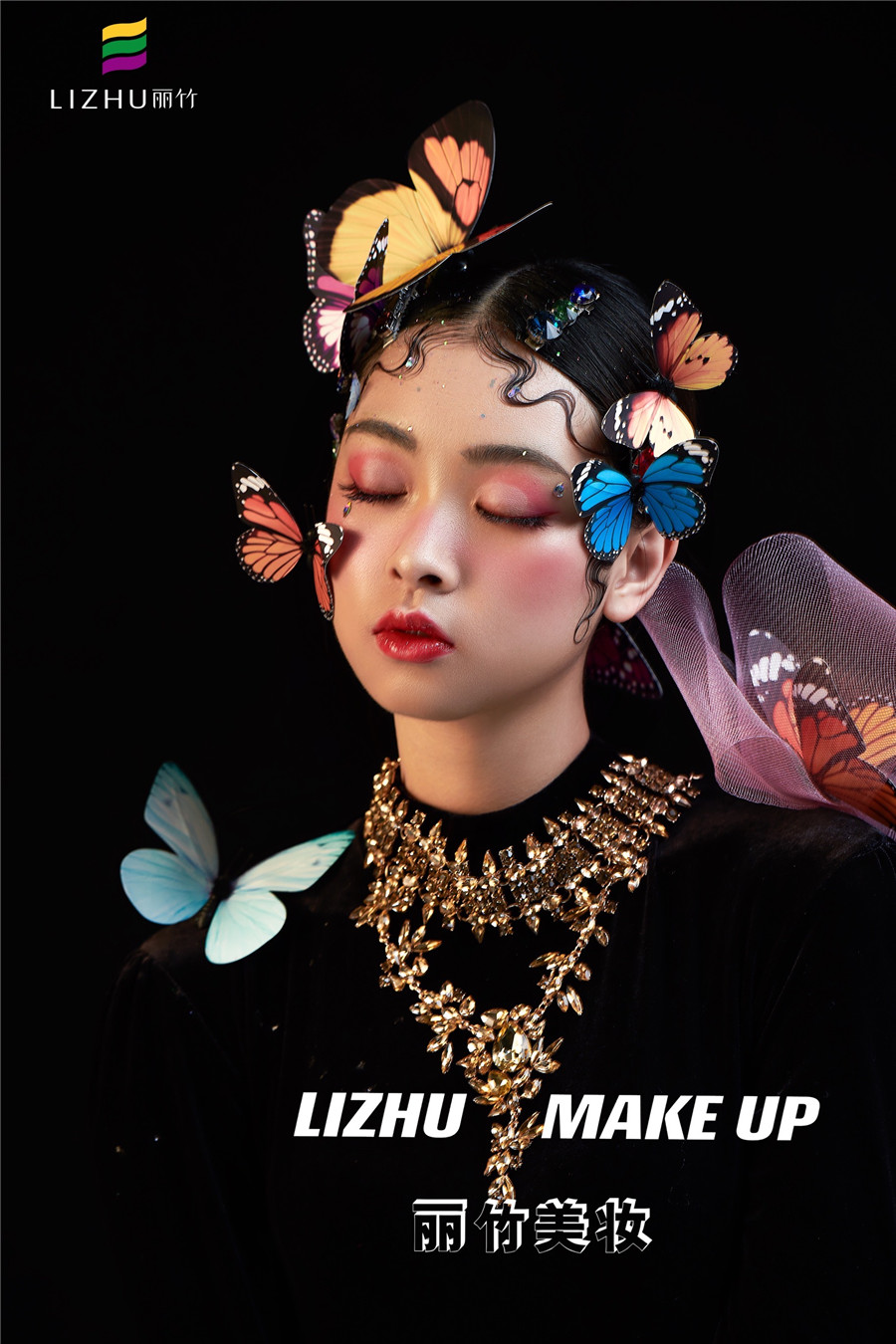 麗竹化妝學校作品---創(chuàng)意蝴蝶妝容:肩頭兩鬢和眼前額頭,被五彩斑斕的蝴蝶點綴,強烈的黑色背景搭配亮眼色差,產(chǎn)生了很強的視覺效果,讓人過目不忘之余,更寓意破繭成蝶涅槃重生的狀態(tài)。