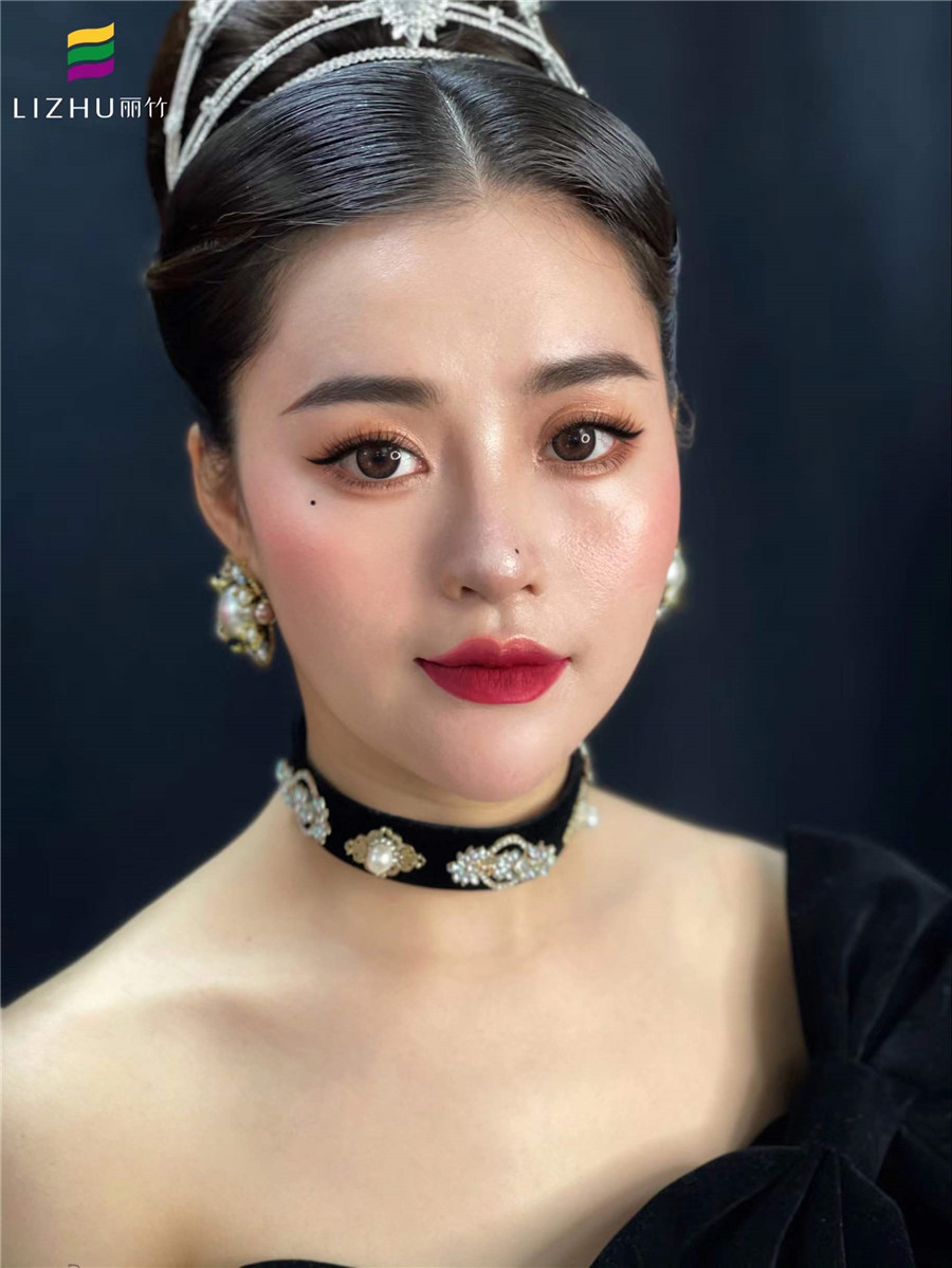 南寧網(wǎng)紅化妝培訓(xùn)作品:優(yōu)雅大方的造型,結(jié)合鉆石復(fù)古發(fā)型,溫柔眉眼帶來(lái)的柔美感覺(jué),即使身穿高冷的黑禮服,也讓人心生愛(ài)戀。