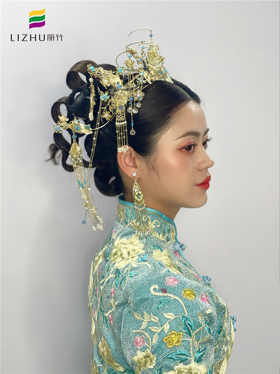 南寧彩妝造型學(xué)校(麗竹學(xué)校彩妝)作品---飽滿的新娘發(fā)型,鎏金玉釵玉簟點綴,紅妝素抹下的溫婉,打造女子的優(yōu)雅古典,展現(xiàn)古香古色的中式韻味。