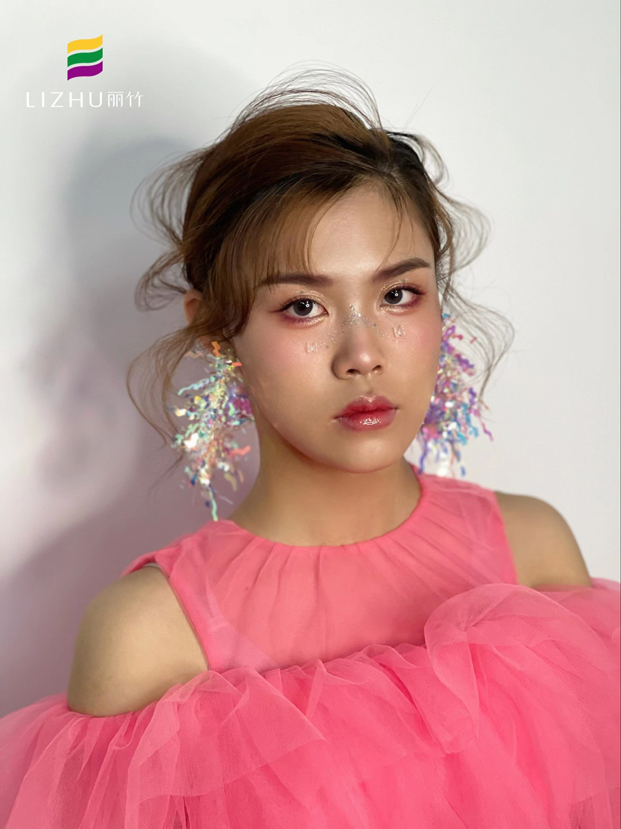 廣西彩妝化妝學(xué)校課堂作品---抽絲靈動(dòng)造型:靈動(dòng)飄逸的低髻抽絲盤發(fā),可鹽可甜的粉狀暈染,超大五彩亮片打造的耳飾,搭配粉色紗裙,滿屏皆是初戀的少女風(fēng)。