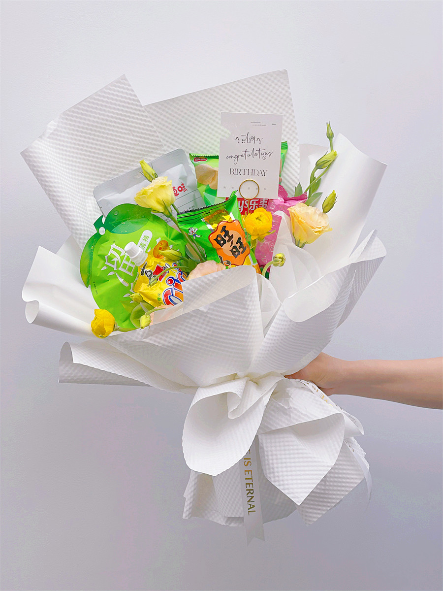 而比較常見的可以用來做花束的零食,比較熱門的則是巧克力。對于熱戀中的情人來說,送上巧克力花束不要太浪漫哦!糖果類做成的花束也深受歡迎,其中棒棒糖花束對學(xué)生黨和小朋友格外有誘惑力。如果想要看起來比較豪放,完全可以選擇膨化類商品,如薯片,本身體積大,做出來的花束也是效果驚人。此外,除了吃的,喝的也是非常適合,比如盒裝牛奶,飲料等都可以通過你專業(yè)的花藝技術(shù)打造出充滿創(chuàng)意的零食花束。