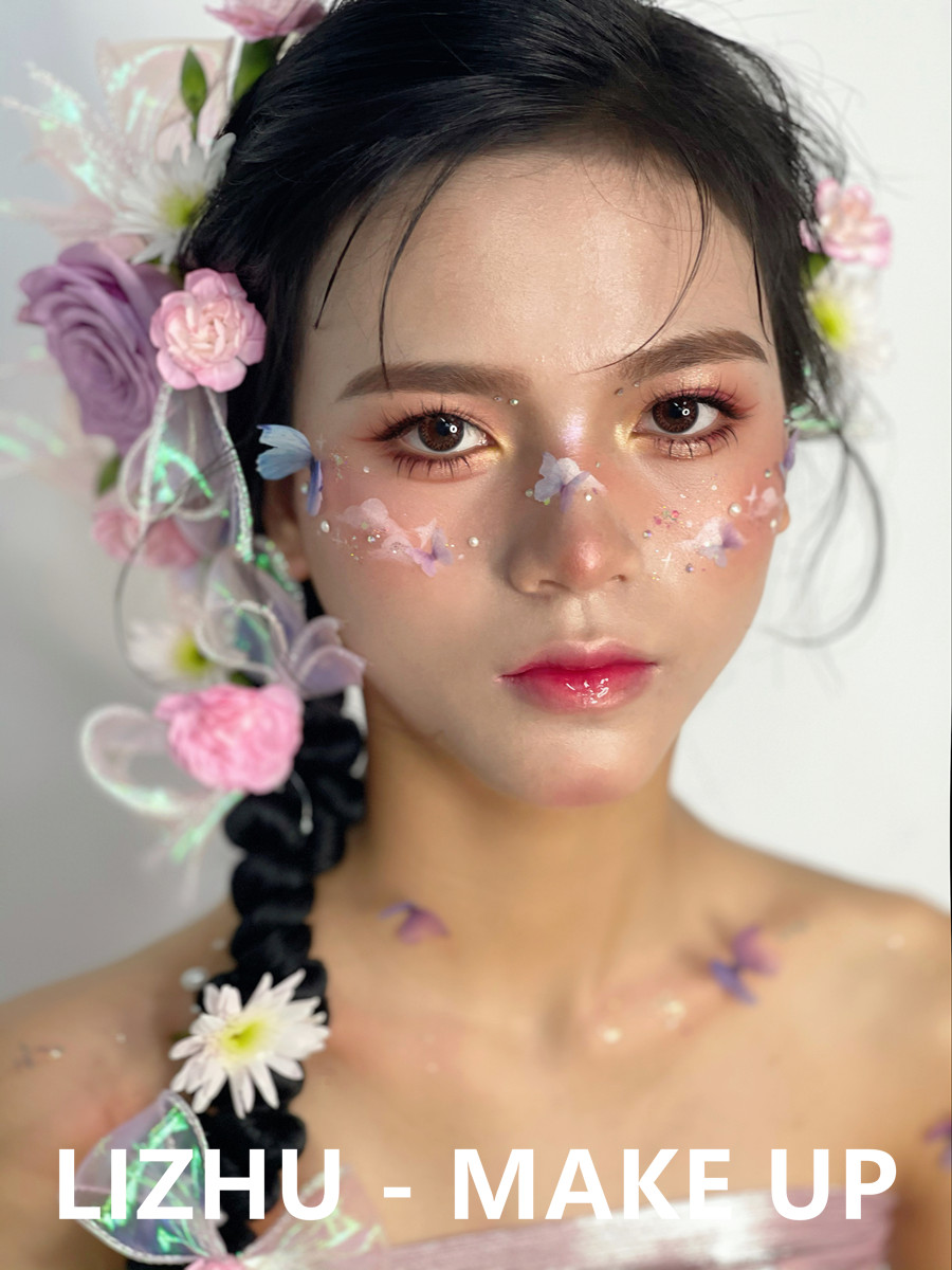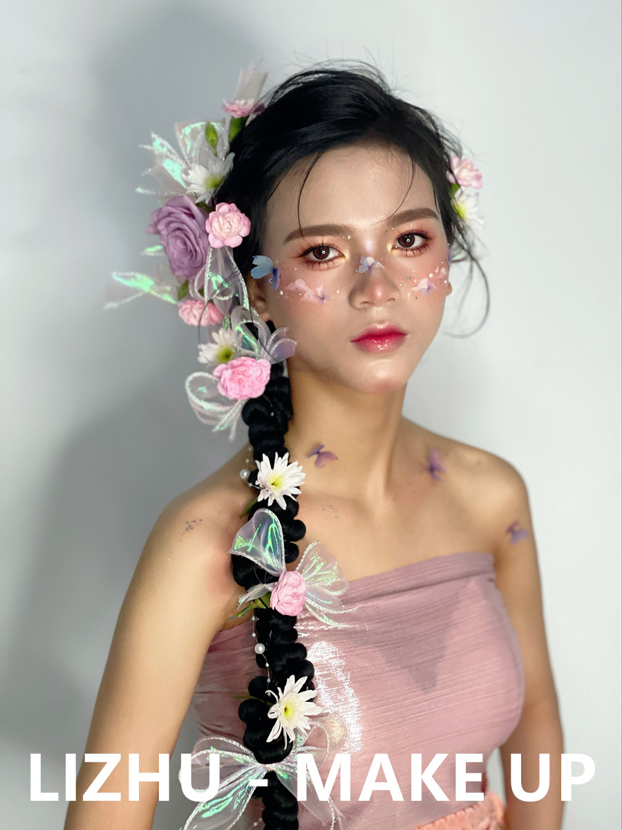 廣西彩妝造型學校作品---哈尼族造型。鮮花滿頭,臉部兩頰被鮮花和用彩繪點綴,呈現(xiàn)出若隱若現(xiàn)宛如世外桃園之感。粉嫩果凍唇妝打造,配以甜蜜少女眼妝,在穿著當?shù)靥厣b,仙氣靈動哈尼族公主造型躍于眼前。