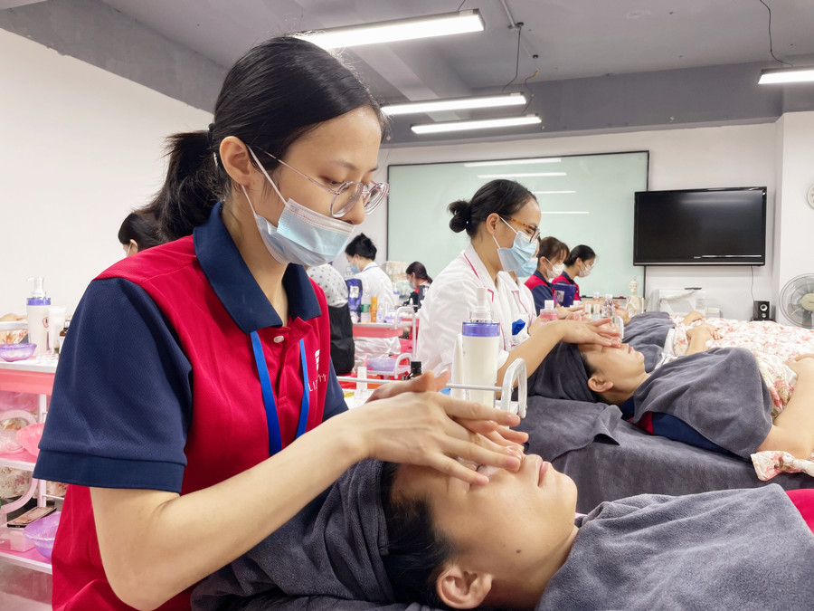 廣西美容課堂實操、廣西皮膚管理培訓:在日常生活中,護膚常用的方法就是涂抹水乳霜或是敷面膜給肌膚緊急補水,以方便后面上妝得宜服帖。但是,如果你真的想要達到護膚的效果,那么就要認真學習下廣西美容專業(yè)課程---皮膚管理的相關內容了。而在廣西美容化妝學校-廣西南寧美容護膚培訓班的教室里,化妝班的學員就在老師的指導進行面部皮膚管理的手法練習。