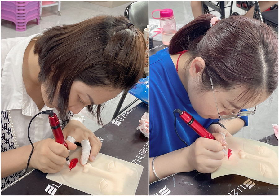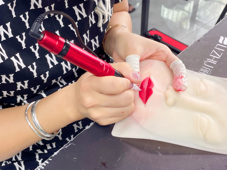 零基礎(chǔ)學紋繡在廣西、廣西紋唇教學:經(jīng)過前面對眉眼唇的理論以及紙上練習,廣西眉眼唇學校-麗竹眉眼唇學校的同學們從了解唇形的構(gòu)造學起,再到紙上練習畫唇,現(xiàn)在進入到了仿皮紋唇練習。
