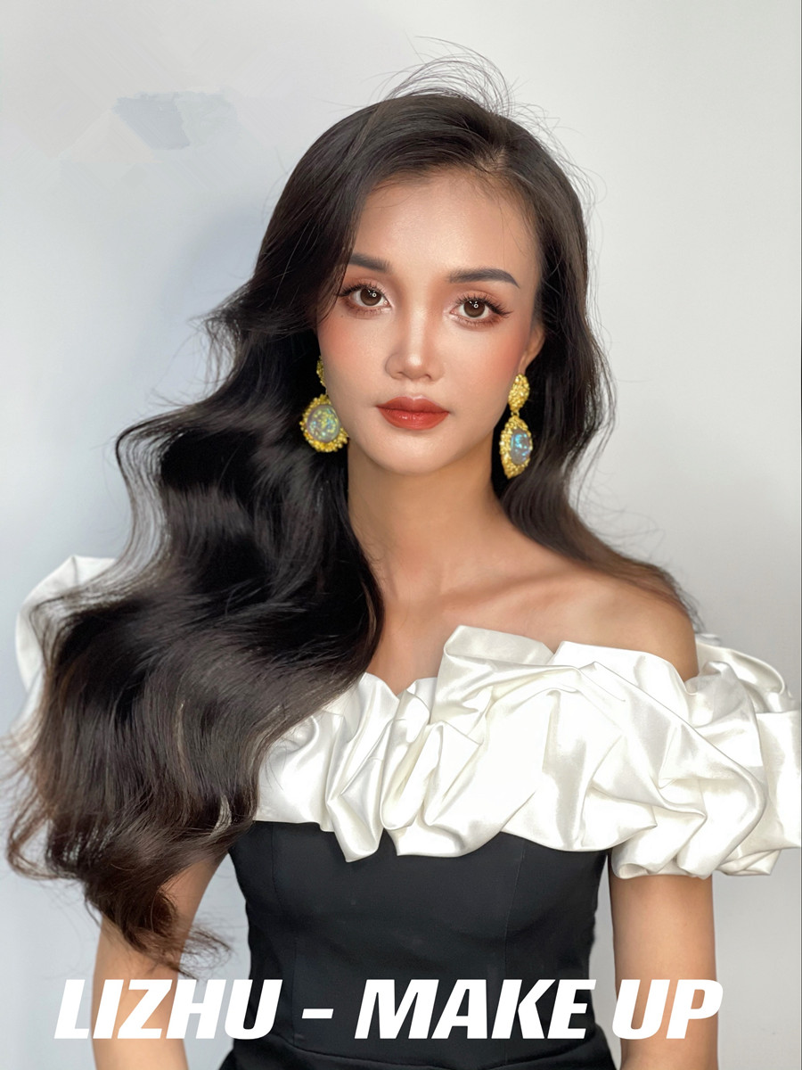腮紅和唇妝采用同色系,起到承上啟下相互呼應的作用。發(fā)型采用靈動流暢的披發(fā)造型,使得整個妝面的打造更具有魅惑特點,彰顯出了濃顏系的泰式妝容。