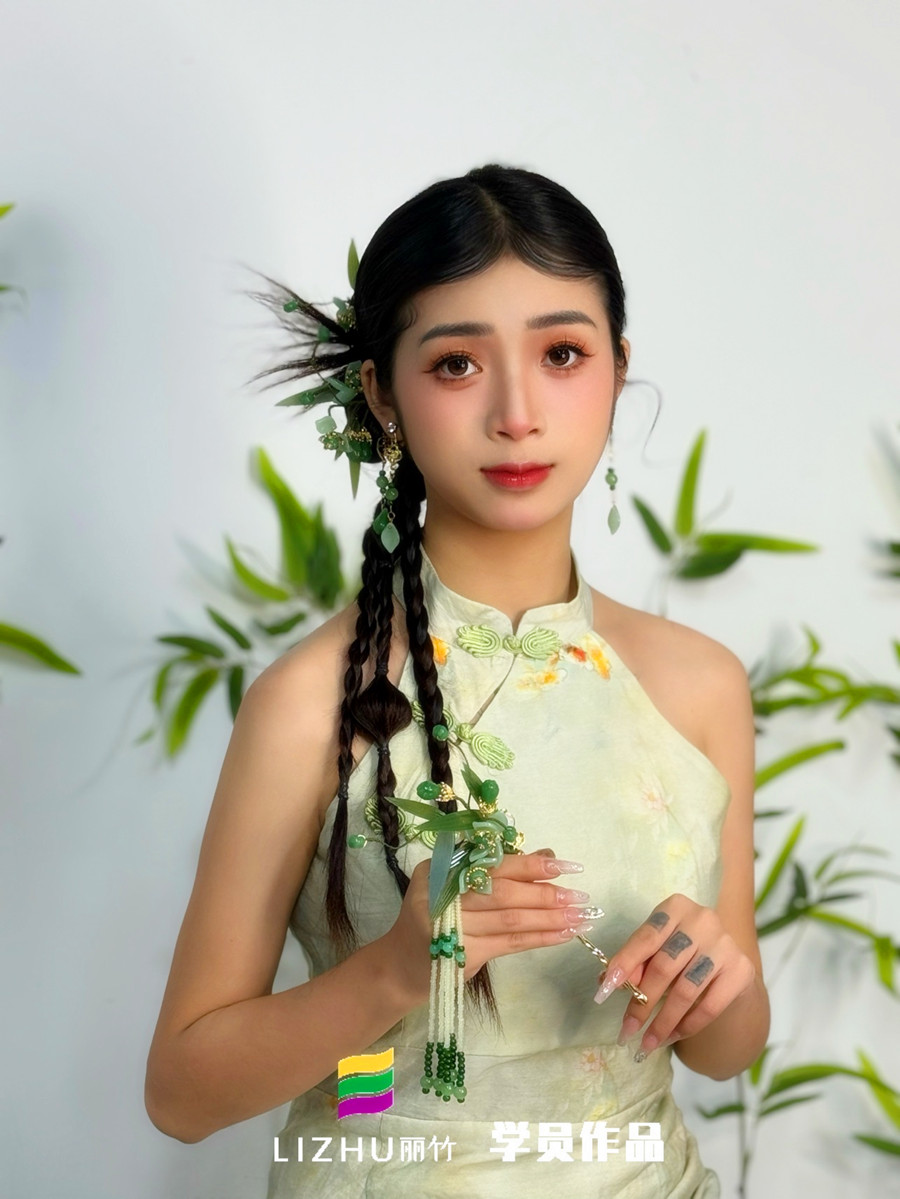 南寧化妝影樓造型、南寧化妝影樓培訓(xùn)(麗竹彩妝寫真培訓(xùn))---新中式造型:新中式長(zhǎng)裙復(fù)古迷人,古風(fēng)盤發(fā)戴翠綠珠釵,綠色搭配竹葉的設(shè)計(jì),給人一種淡雅的感覺。如果你想學(xué)個(gè)人寫真藝術(shù)照造型,或是想在南寧培訓(xùn)寫真化妝,學(xué)更加全面的化妝技術(shù),建議你可以趁著麗竹學(xué)校正在進(jìn)行春季招生優(yōu)惠活動(dòng),趕緊聯(lián)系我們報(bào)名吧!