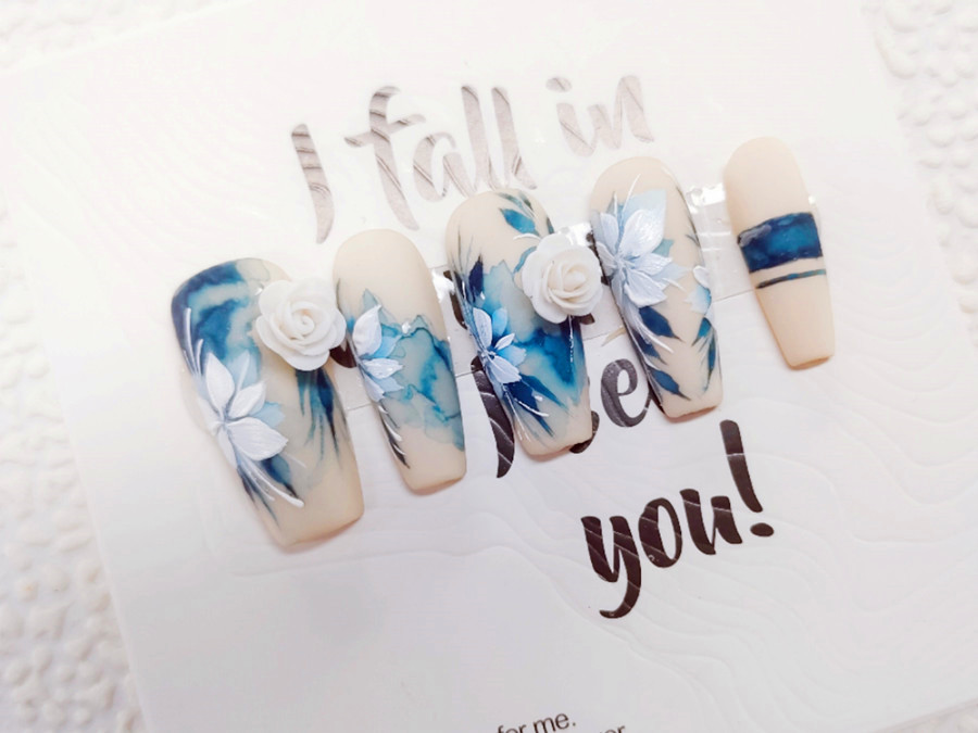 南寧美甲師、南寧美甲培訓(xùn)排名:水墨畫是非常有中華民族特色的一種繪畫形式,具有單純性、象征性、自然性。它具有水乳交融,酣暢淋漓的藝術(shù)效果。整副美甲以乳白色打底,蘸取深藍(lán)色彩繪膠,使用暈染的手法打造出水墨虛實(shí)相交的效果。然后在用白色雕花膠捏出立體花瓣,這樣一副栩栩如生的國風(fēng)雕花美甲便完成了。