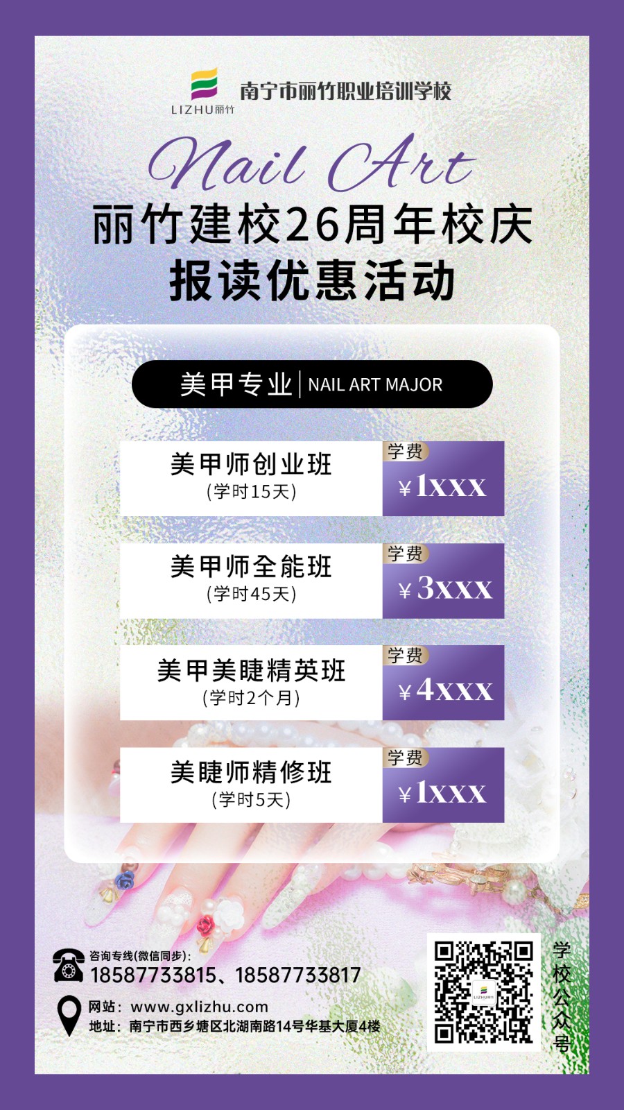 如果你喜愛美甲,想從事美甲行業(yè)的相關(guān)工作,但是不知道南寧美甲學(xué)校怎么報名?只要你對美甲感興趣,有一顆想學(xué)習(xí)的心,那千萬不要錯過麗竹學(xué)校正在進行的26周年校慶之“報讀優(yōu)惠活動”啦!歡迎關(guān)注麗竹學(xué)校了解更多課程詳情和活動信息。