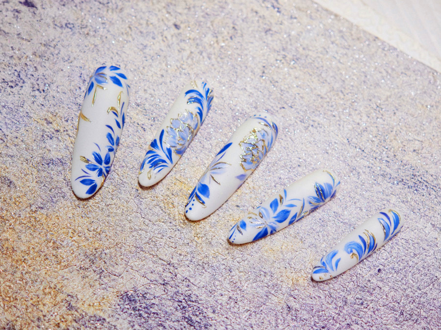 整副美甲作品,汲取國風(fēng)經(jīng)典青花元素作為整副美甲的主體。以乳白色作為底色,再涂抹磨砂封層增加質(zhì)感。之后,用彩繪筆繪畫出花瓣,蘸取金屬膠勾勒花瓣邊緣,打造古典國風(fēng)氣息的同時,更添加了幾分雅韻。