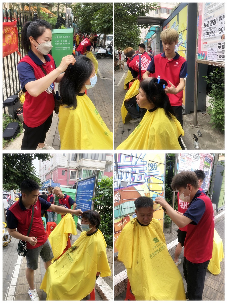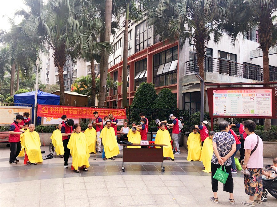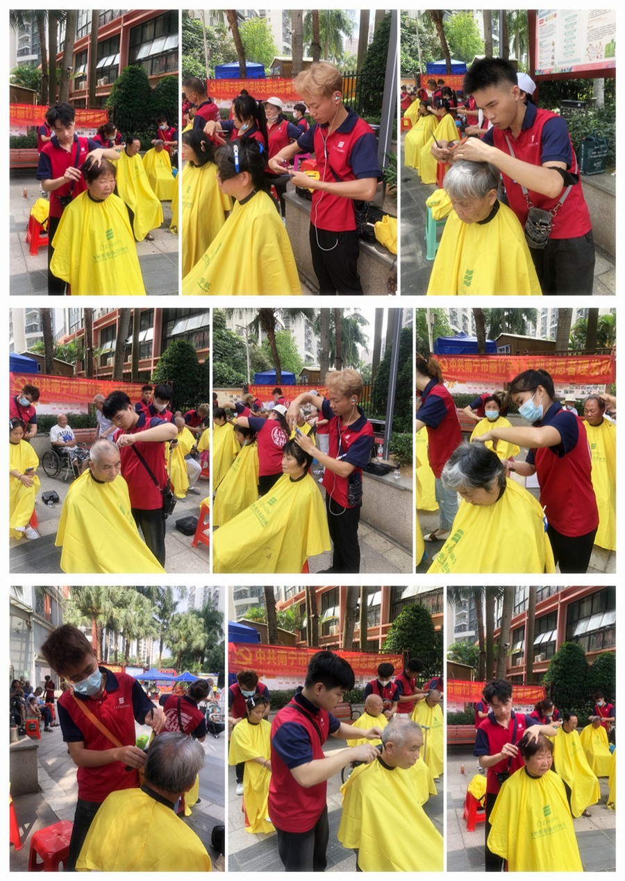 2023年5月26日,南寧美發(fā)培訓(xùn)班志愿者們?yōu)榻先A府小區(qū)居民進(jìn)行理發(fā)活動(dòng)