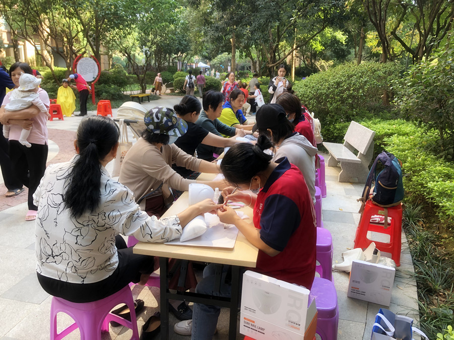 因?yàn)閳龅赜邢?,雖然在現(xiàn)場只為大家進(jìn)行了基礎(chǔ)的修手,去死皮,打磨甲型,進(jìn)行手部護(hù)理,還有涂抹單色和進(jìn)行簡單的暈染款美甲,但居民們還是給我們的美甲志愿者打出高分之余,并對她們的專業(yè)性表示了肯定。
