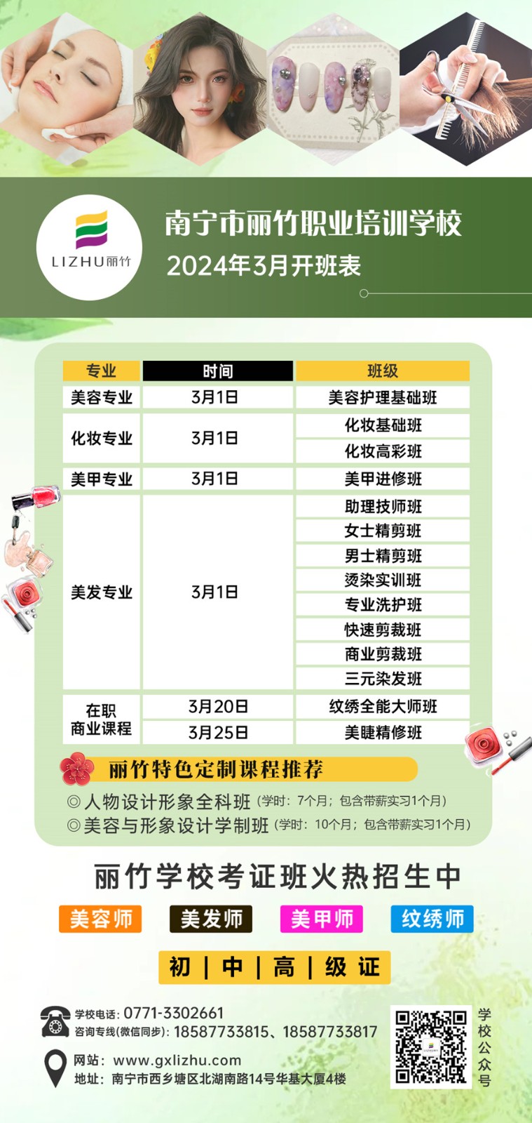 如果你想學(xué)習(xí)美業(yè)技術(shù),想在廣西零基礎(chǔ)學(xué)美容美發(fā)?想知道廣西化妝美甲培訓(xùn)在哪里?廣西哪里學(xué)紋繡專業(yè)?同時(shí)還想到廣西美睫學(xué)校去學(xué)美睫?那么,請(qǐng)你千萬(wàn)不要錯(cuò)過(guò)廣西美業(yè)專業(yè)職業(yè)學(xué)校-麗竹學(xué)校3月的開(kāi)班安排了啦!早學(xué)早就業(yè),就能早點(diǎn)實(shí)現(xiàn)人生目標(biāo)。